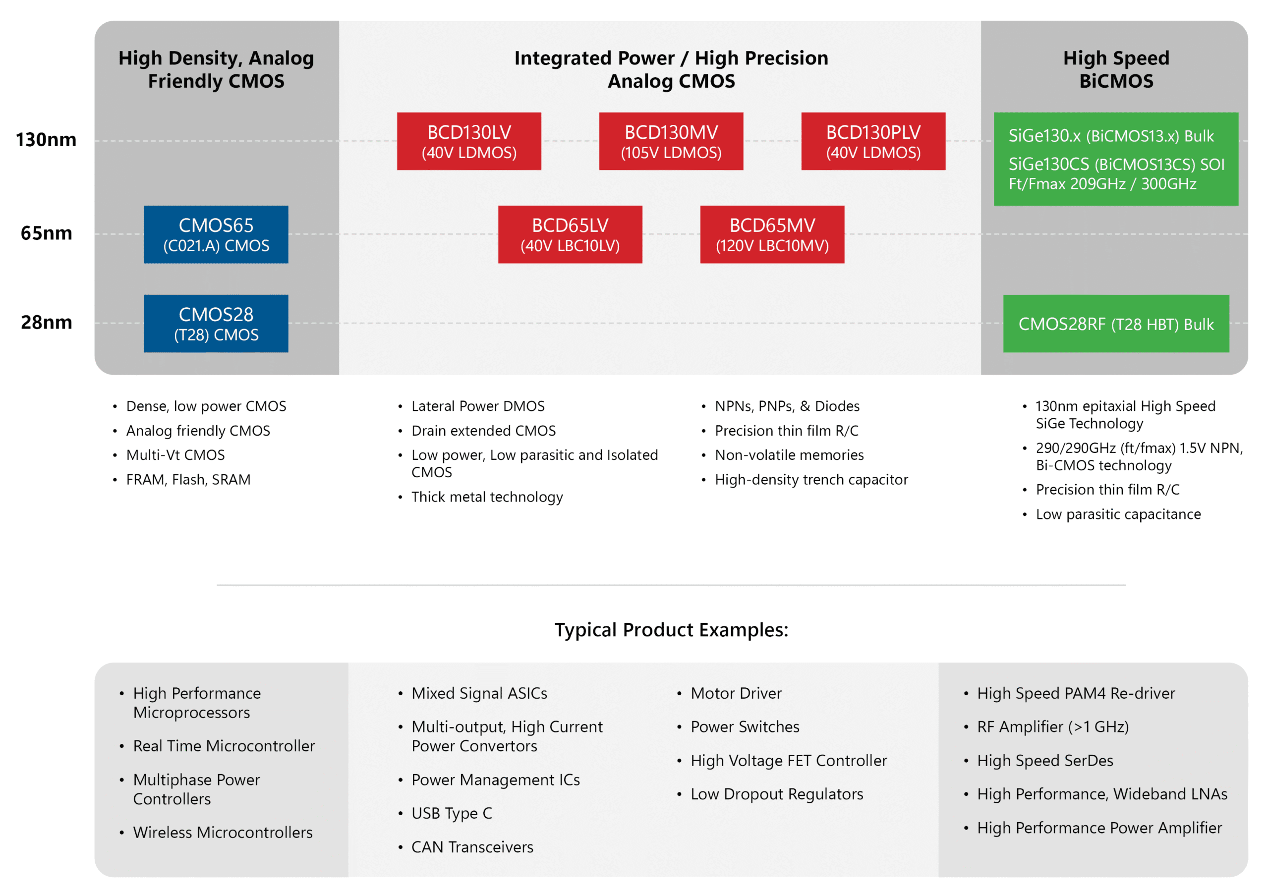 Spirit Electronics offers Texas Instruments’ BCD130 family of process technologies that are ideal for power management, analog front end, and applications that require high voltage operation with significant digital density. The BCD130MV includes LDMOS components up to 105V and the BCD130PLV includes LDMOS components up to 40V.